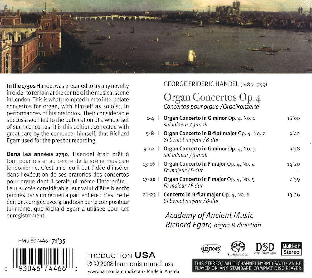 In the 1730s Handel was prepared to try any novelty in order to remain at the centre of the musical scene in London. This is what prompted him to interpolate concertos for organ, with himself as soloist, in performances of his oratorios. Their considerable success soon led to the publication of a whole set of such concertos: it is this edition, corrected with great care by the composer himself, that Richard Egarr used for the present recording.